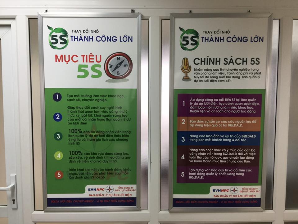 Trong năm 2018, Tổng công ty Điện lực miền Bắc (Tập đoàn Điện lực Việt Nam) đã khởi động chương trình 5S với mục tiêu hình thành thói quen làm việc chuyên nghiệp của cán bộ công nhân viên và người lao động; đảm bảo các công việc hằng ngày trong hoạt động sản xuất kinh doanh được điều hành và tổ chức thực hiện một cách khoa học; tối ưu hóa thời gian và tránh lãng phí trong việc quản lý hồ sơ, thiết bị, công cụ… Nhằm tiếp tục đẩy mạnh và đưa chương trình 5S từ Văn phòng ra lưới điện đi vào chiều sâu, Tổng công ty Điện lực miền Bắc đã yêu cầu các đơn vị triển khai các công việc cụ thể như: