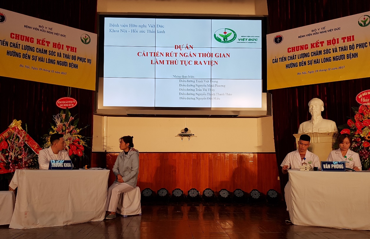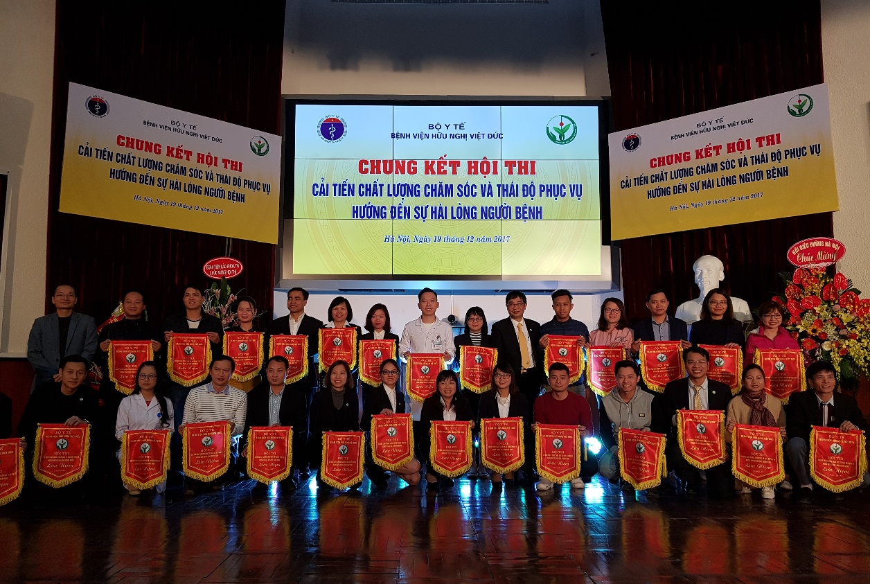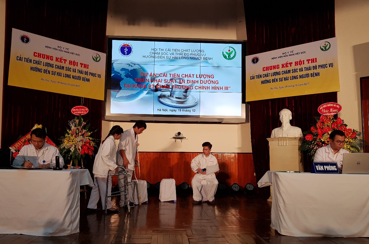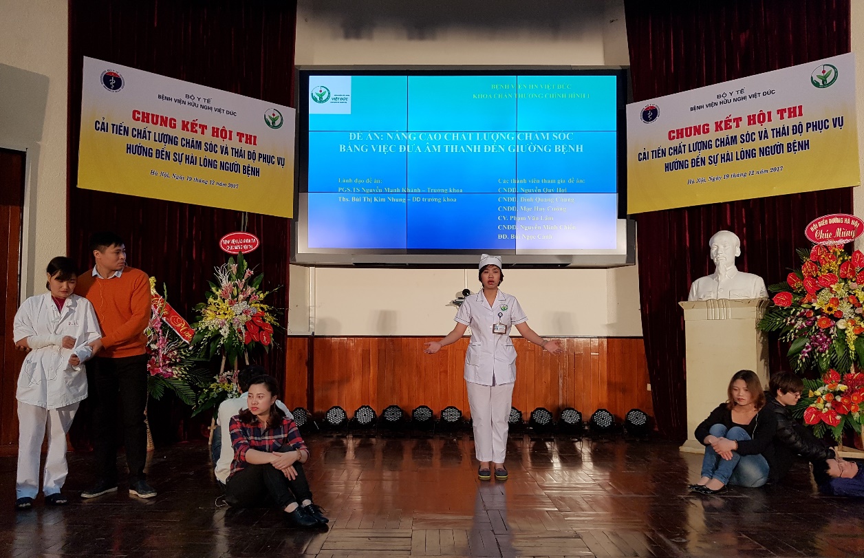 Và mới đây, Bệnh viện Hữu nghị Việt Đức đã tổ chức chung kết cuộc thi “CẢI TIẾN CHẤT LƯỢNG CHĂM SÓC VÀ THÁI ĐỘ PHỤC VỤ HƯỚNG ĐẾN SỰ HÀI LÒNG NGƯỜI BỆNH”. Đến tham dự có các đại biểu: BSCK II Trần Thị Bích Hằng – Chủ tịch Công đoàn Y tế Việt Nam; ThS. Nguyễn Trọng Khoa – Phó Cục trưởng Cục quản lý khám chữa bệnh Bộ Y tế; ThS. Phạm Đức Mục – Chủ tịch Hội Điều dưỡng Việt Nam; ông Nguyễn Anh Tuấn - Viện trưởng Viện Năng suất Việt Nam; bà Vũ Hồng Dân - Trưởng phòng tư vấn và cải tiến năng suất Viện năng suất Việt Nam; GS, TS. Trần Bình Giang – Bí thư Đảng ủy, Giám đốc Bệnh viện Hữu nghị Việt Đức; TS. Trần Đình Thơ - Phó Giám đốc bệnh viện; TS. Lê Tư Hoàng – Chủ tịch Công đoàn bệnh viện cùng sự tham dự của lãnh đạo các bệnh viện, lãnh đạo các phòng ban cùng các chi hội điều dưỡng.