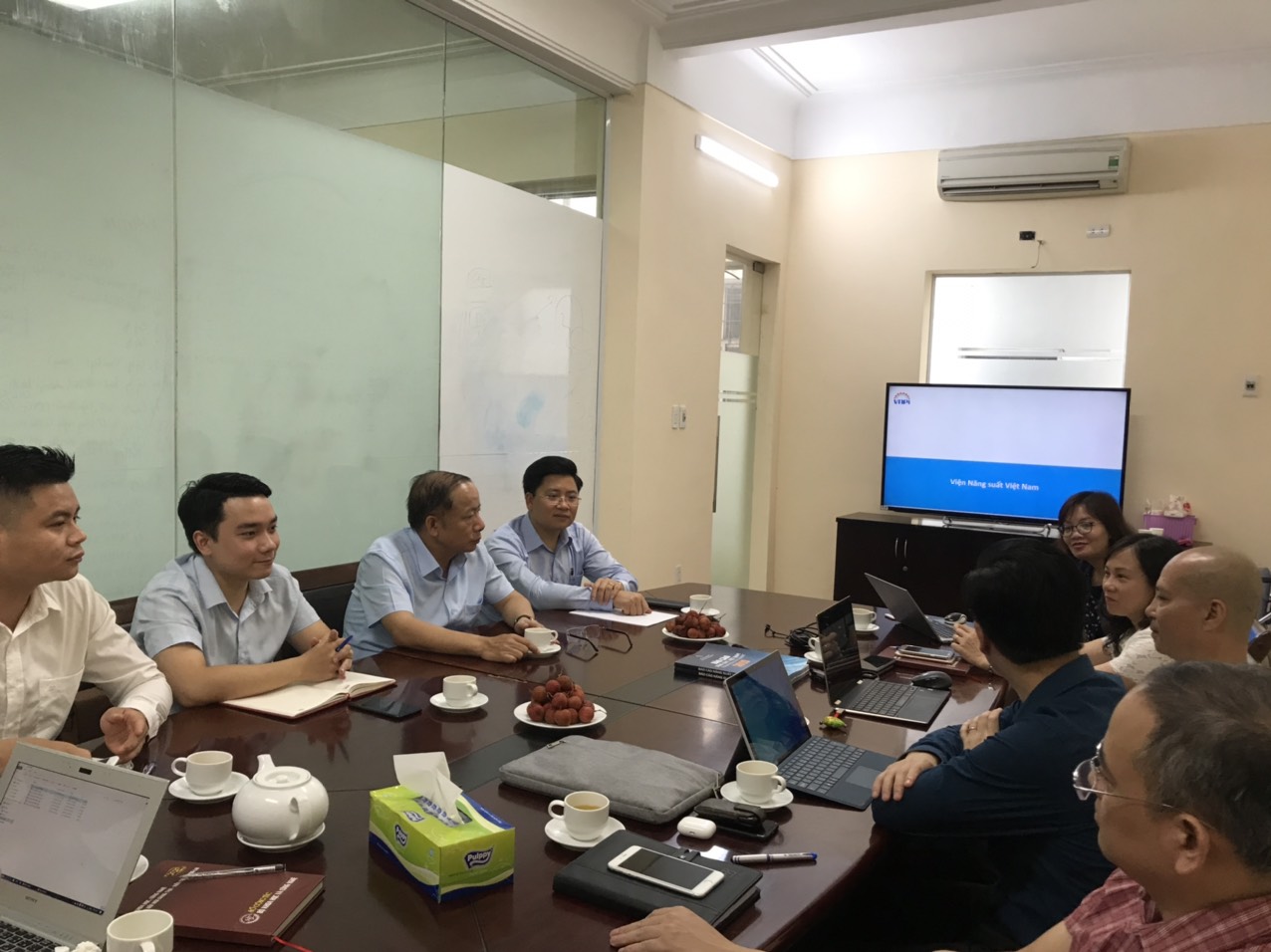 Tiếp và làm việc với đoàn có ông Hà Minh Hiệp- Phó Tổng cục trưởng, Tổng cục Tiêu chuẩn Đo lường Chất lượng, bà Nguyễn Thu Hiền- Phó Viện trưởng Viện Năng suất Việt Nam cùng các lãnh đạo phòng, chuyên gia tư vấn của Viện. Ông Nguyễn Văn Thân - Chủ tịch Hiệp hội Doanh nghiệp nhỏ và vừa Việt Nam, ông Nguyễn Kim Hùng - Phó Viện trưởng Viện Khoa học Quản trị doanh nghiệp nhỏ và vừa Việt Nam và các cán bộ từ Hiệp hội và Viện.