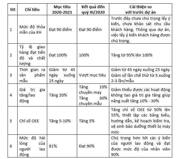Các nhóm cải tiến được hỗ trợ đào tạo kiến thức, phương pháp và huấn luyện kỹ năng cải tiến năng suất, chất lượng cho đội ngũ cán bộ chủ chốt từ Tổ trưởng tổ sản xuất trở lên. Đồng thời xây dựng môi trường làm việc an toàn và khuyến khích các hoạt động cải tiến, đổi mới và sáng tạo. Sau 06 tháng triển khai áp dụng các giải pháp cải tiến năng suất trên toàn bộ các trụ cột, công ty thu được các kết quả bước đầu như sau: