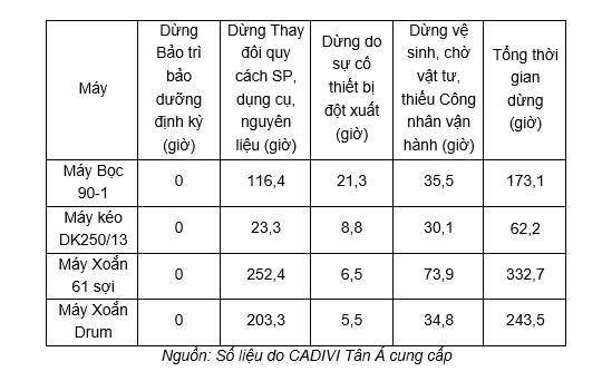 Có thể thấy rằng, nguyên nhân chính của việc dừng máy đến từ việc thay đổi quy cách sản phẩm, dụng cụ, nguyên liệu (chiếm từ 60% – 80% tổng thời gian dừng), kế đến là dừng vệ sinh, chờ vật tư, thiếu công nhân vận hành (chiếm từ 20% – 40% tổng thời gian dừng), cuối cùng là do sự cố thiết bị đột xuất (dưới 15% tổng thời gian dừng).
