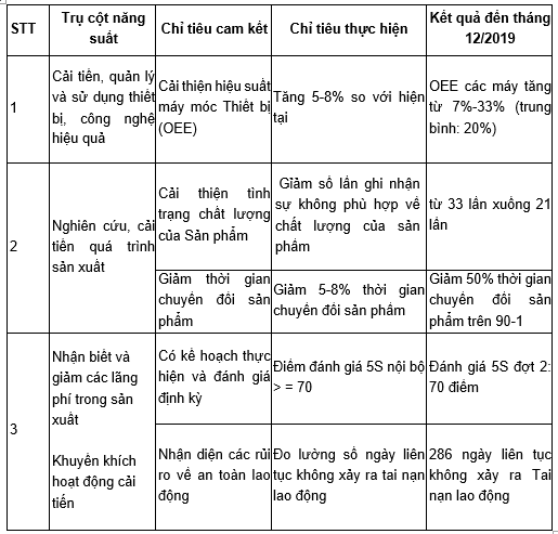 Việc thực hiện các dự án cải tiến điểm theo TPI sẽ giúp công ty nâng cao hiệu suất thiết bị, từ đó dẫn tới nâng cao năng suất của nhà máy; chuẩn hoá các quá trình hoạt động, tạo điều kiện cho dự án áp dụng phần mềm ERP tại Công ty cũng bắt đầu trong năm 2019 được hiệu quả; đồng thời nâng cao chất lượng nguồn nhân lực, có kiến thức và khả năng thực hiện các chương trình cải tiến tại Công ty trong các giai đoạn tiếp theo.