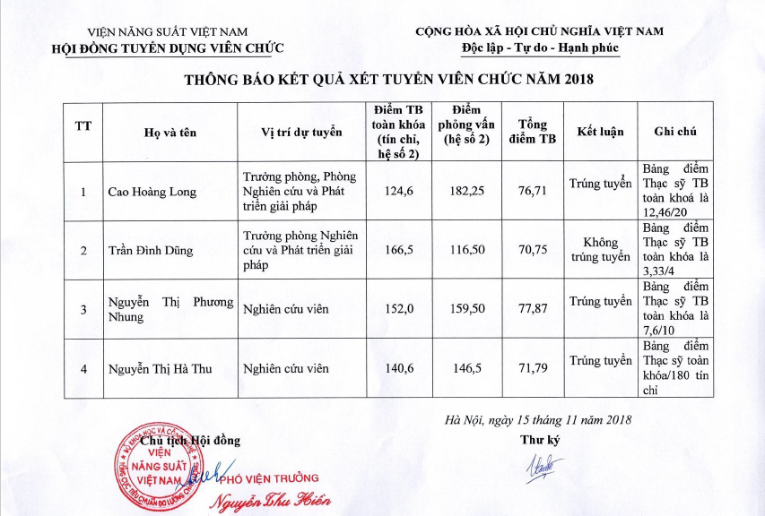 Viện Năng suất Việt Nam xin thông báo kết quả tuyển dụng viên chức năm 2018 như sau: