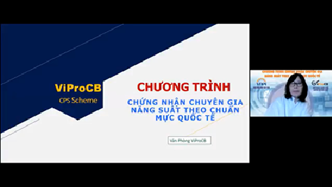 Bà Nguyễn Thị Bích Hằng, đại diện Văn phòng chứng nhận chuyên gia năng suất (ViProCB) đã giới thiệu về Hệ thống chứng nhận chuyên gia năng suất và chia sẻ về lộ trình để trở thành chuyên gia năng suất được chứng nhận theo chuẩn mực của APO.